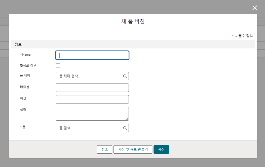 <table><thead><tr><th width="194">항목</th><th width="453">설명</th><th>필수</th></tr></thead><tbody><tr><td>Name</td><td>폼 버전의 이름을 기재합니다.</td><td><mark style="color:red;">✔️</mark></td></tr><tr><td>활성화 여부</td><td>한 폼에대한 여러 폼버전 중 실제로 사용할 폼일 경우에 활성화 합니다.</td><td></td></tr><tr><td>폼 테마</td><td>폼의 header, footer, style를 설정하는 개체를 의미합니다.</td><td></td></tr><tr><td>레이블</td><td>폼 버전의 레이블을 기재합니다.</td><td></td></tr><tr><td>버전</td><td>폼 버전의 버전을 기재합니다.</td><td></td></tr><tr><td>설명</td><td>폼 버전의 설명을 기재합니다.</td><td></td></tr><tr><td>폼</td><td>폼 버전의 부모인 폼을 의미합니다.</td><td><mark style="color:red;">✔️</mark></td></tr></tbody></table>