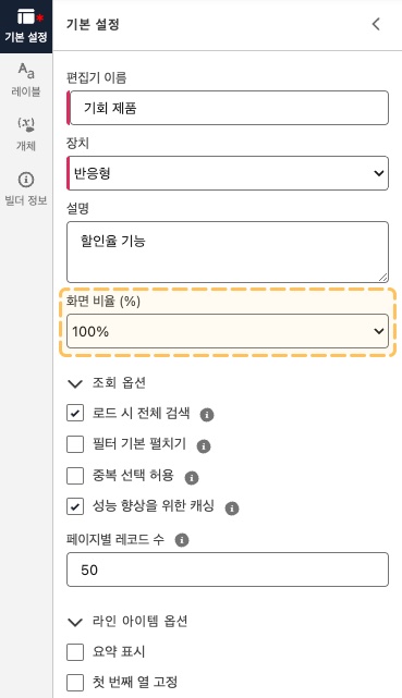편집기에 표시되는 열이 많은 경우, 화면 비율을 낮추면 한 화면에서 더 많은 열을 확인할 수 있습니다.