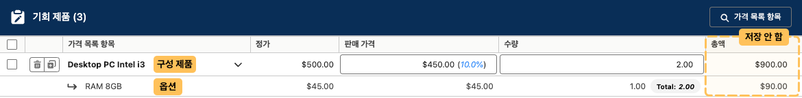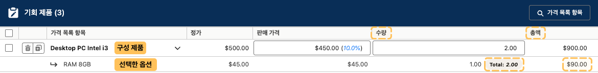 2 (구성 제품 수량) × 1 (옵션 수량) = 2 (옵션 총 수량)