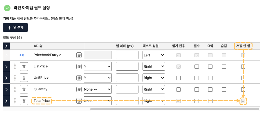 매핑된 라인 아이템의 필드가 세일즈포스 필드 권한에서 읽기 전용으로 설정된 경우, 해당 필드는 저장되지 않습니다.