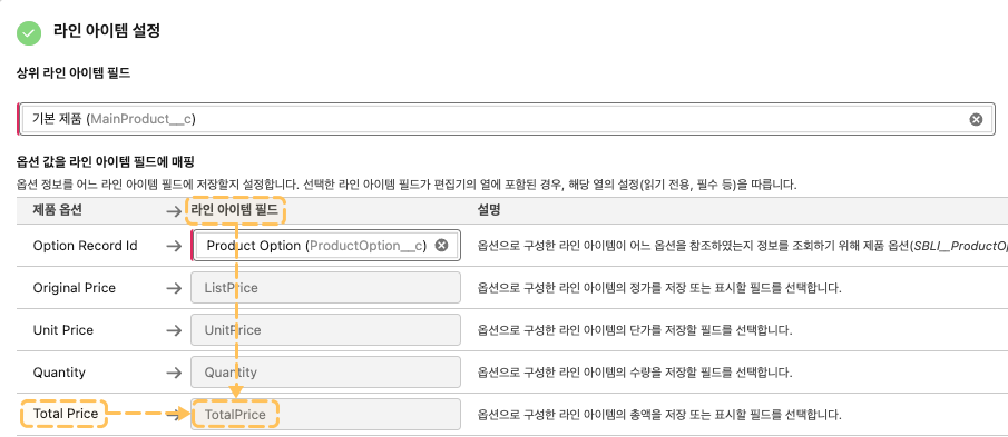 제품 옵션의 Total Price 값이 라인 아이템의 총액(TotalPrice) 필드로 매핑되어 있습니다.