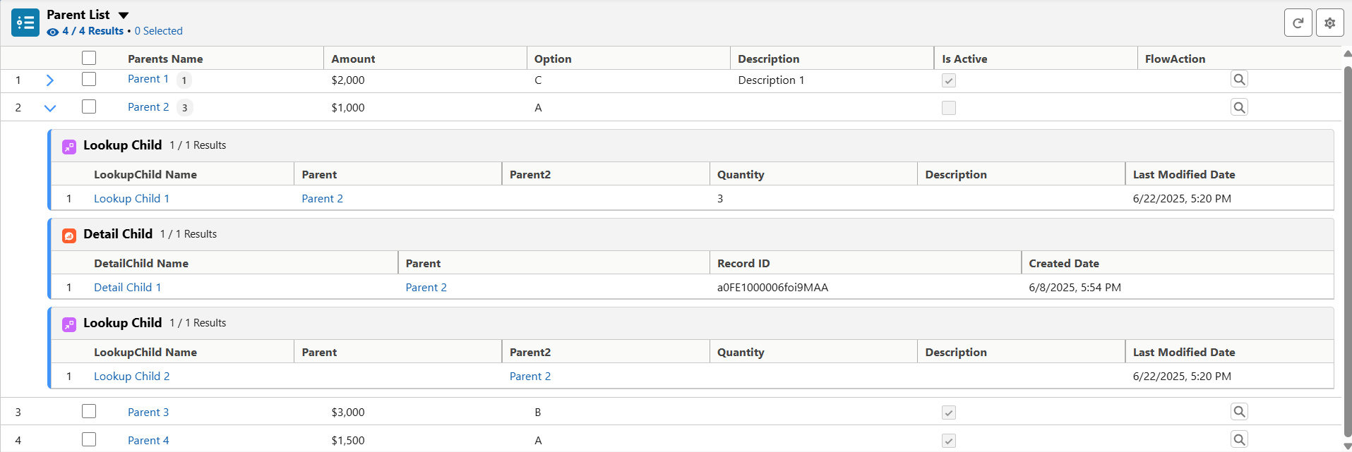 하나의 리스트 화면에서 관련된 하위 레코드를 함께 확인 할 수 있는 하위 리스트 연결 기능이 새롭게 추가되었습니다. 리스트 구성기의 대상 개체와 **마스터-디테일** 또는 **조회** 관계로 연결된 하위 개체가 있는 경우, 해당 하위 개체를 기반으로 생성된 리스트 구성기를 하위 리스트로 연결할 수 있습니다. 이를 통해 리스트의 레코드와 그에 연결된 하위 레코드들을 한 화면에서 직관적으로 확인할 수 있습니다.