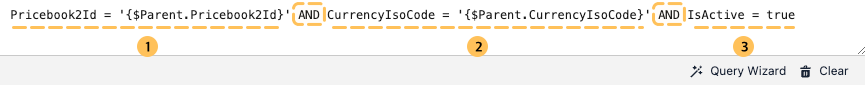 This configuration ensures that only Pricebook Entries matching the parent object’s Pricebook are retrieved. The Query Wizard automatically generates the necessary filter syntax, making it easy and convenient to add conditions.