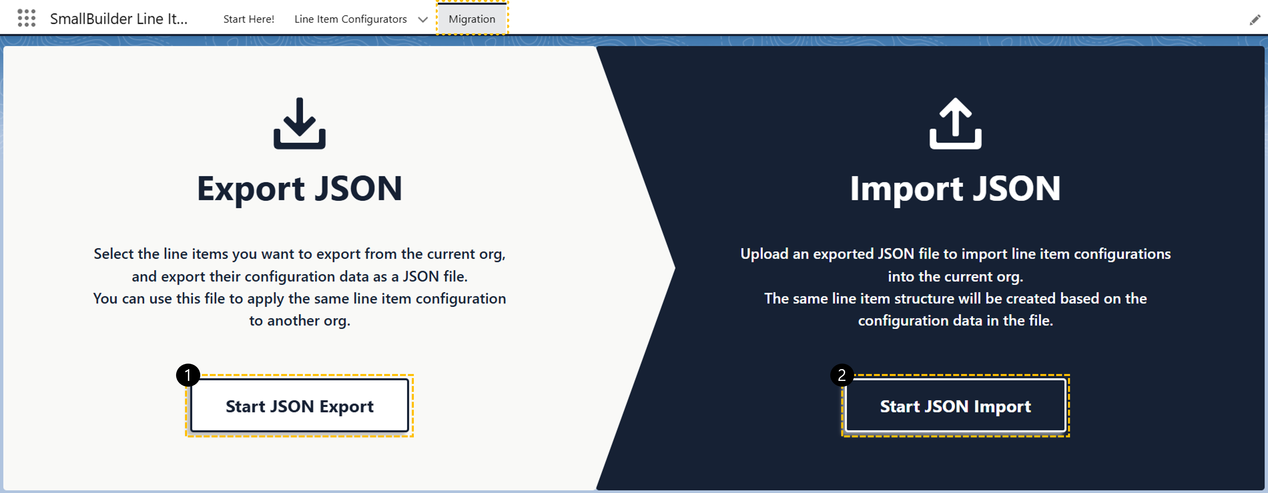 You can export the current org’s Line Item Builder configuration as a JSON file, or import a JSON file created in another org to perform a migration.\