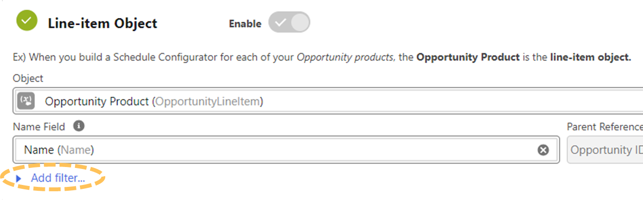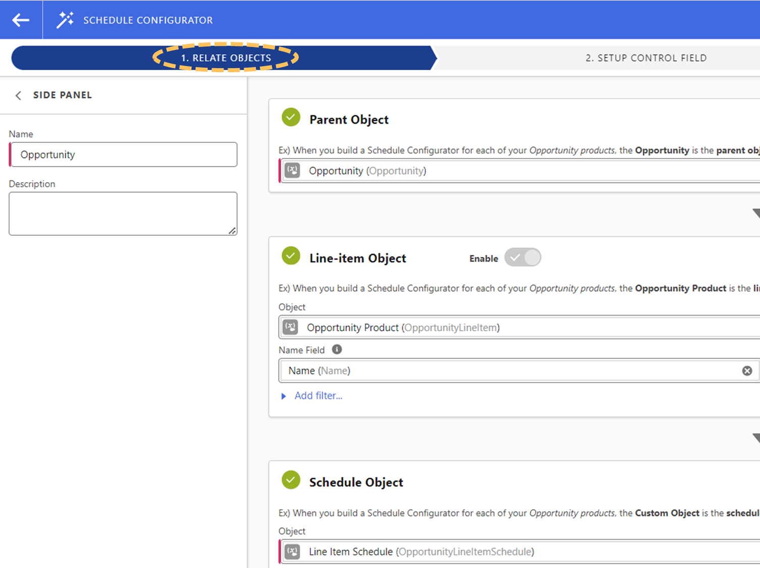 To implement the Schedule Configurator, you first need to specify a Parent object, a Line-item object, and a Schedule object.