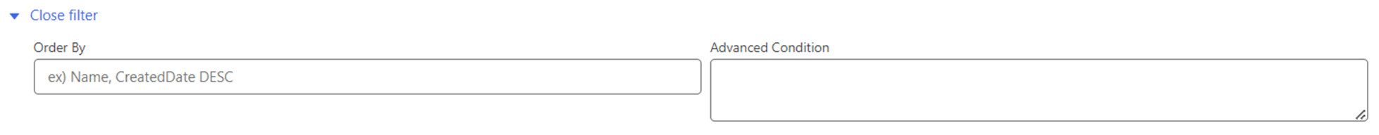 <table><thead><tr><th width="202">Item</th><th>Description</th></tr></thead><tbody><tr><td>Order By</td><td><p>Sets the sorting when returning records for a saved line-item. Enter the <code>ORDER BY</code> clause in SOQL.<br></p><p>For example, if you want results to appear in descending date order, you can write <code>CreatedDate DESC</code>.</p></td></tr><tr><td>Advanced Condition</td><td>Specify a pre-filter condition to restrict the results users will see. Enter the <code>WHERE</code> clause in SOQL.<br><br>For example, if you want users to see only records that are active (field: isActive), you can write <code>IsActive = true</code>.</td></tr></tbody></table>